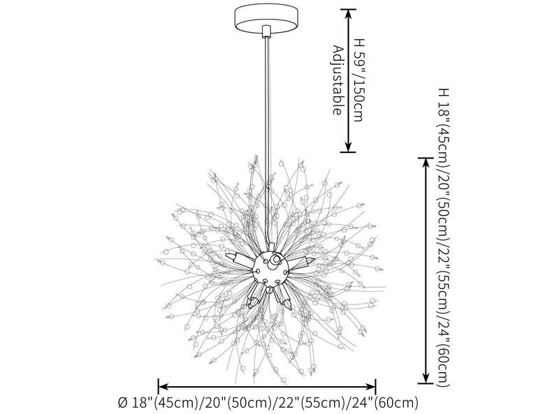 These stunning chandelier lights feature a striking "burst" design, with multiple branches extending outward, each adorned with clear crystal beads that capture and reflect light beautifully. The light fixtures come in various finishes, including chrome and gold, with a modern and luxurious look. Replaceable LED bulbs are spread throughout the design, providing bright, ambient lighting while enhancing the chandelier's elegant aesthetic. Perfect for contemporary interiors, living rooms, dining areas, or entryways, these chandeliers offer both dramatic visual impact and functional illumination.