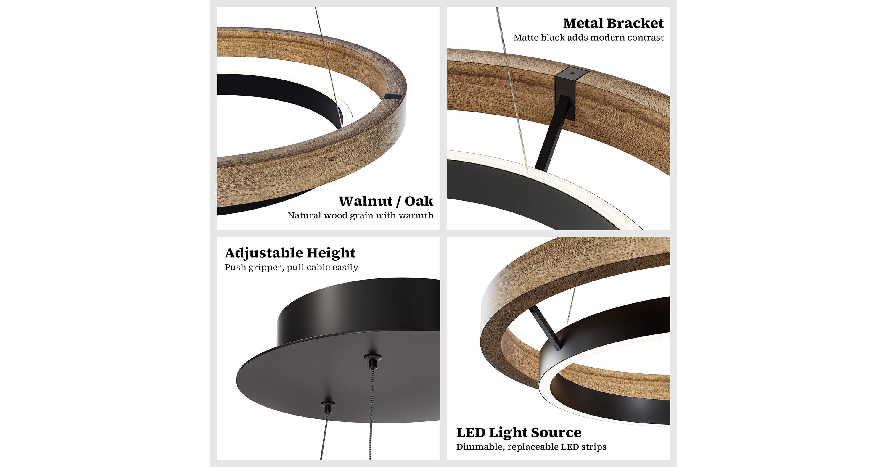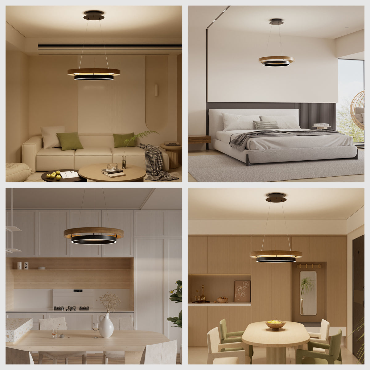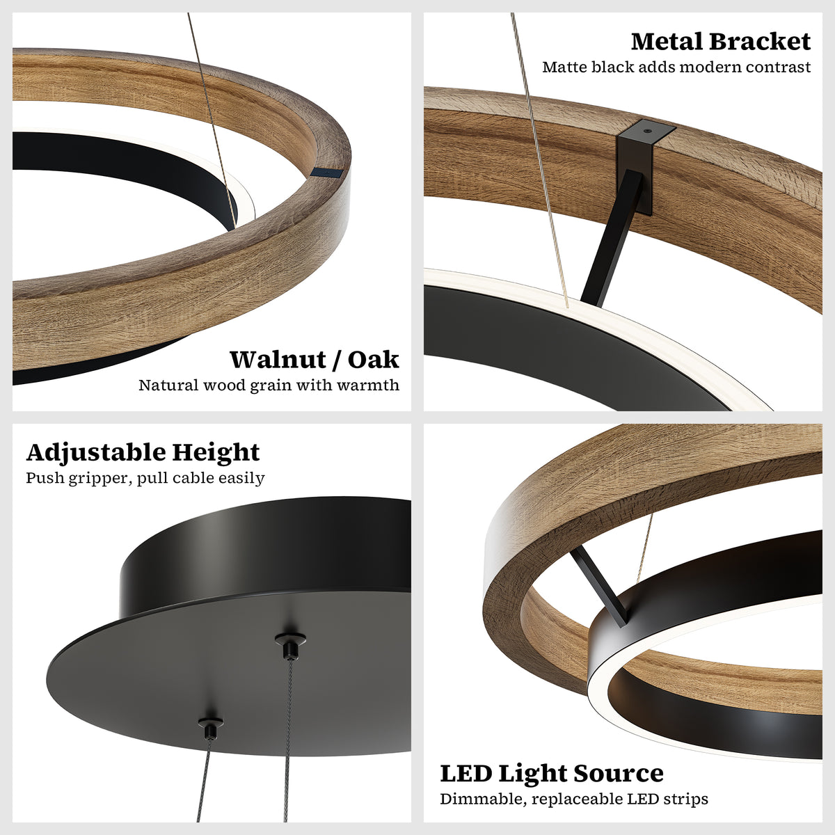 Add a touch of modern farmhouse charm to your dining room with the WOMO Wood Circular Led Chandelier-WM2492. The upper ring in weathered oak or walnut pairs beautifully with the lower black ring, which integrates a LED strip for added functionality and style. Elevate your dining experience with this stylish and energy-efficient chandelier.