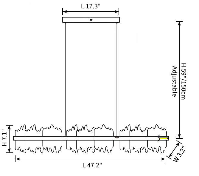 Upgrade your dining experience with this stunning and contemporary lighting fixture. The Iceberg Design LED Chandelier combines sleek lines with a touch of luxury, creating an eye-catching focal point in any dining room or kitchen island setting. This stunning chandelier has irregular borders, mimicking the beauty of glowing icicles, and is a perfect complement to spaces that require linear lighting. The black iron body of the study contrasts with polished stainless steel bars, and the modern juxtaposition is just right.
